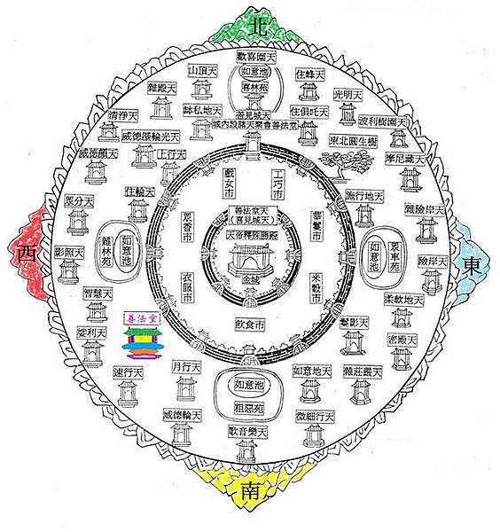 須彌山頂中央是善見城,為帝釋天主所居住。東、西、南、北四方各有八天,
