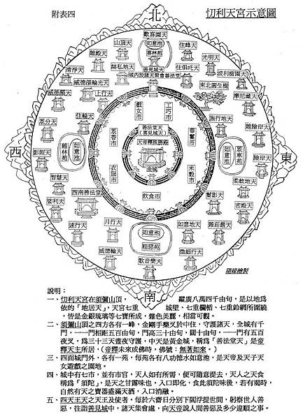 諸忉利,譯成中文是「三十三」。三十三天不是指三十三層,而是從平面說,