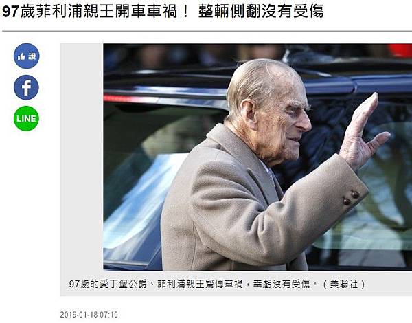 分享97歲菲利浦親王開車車禍! 整輛側翻沒有受傷到Facebook 分享97歲菲利浦親王開車車禍! 整輛側翻沒有受傷到Line