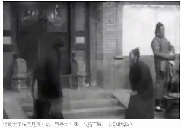 滿族女子特有見禮方式,兩手扶左膝,右腿下蹲。(視頻截圖)