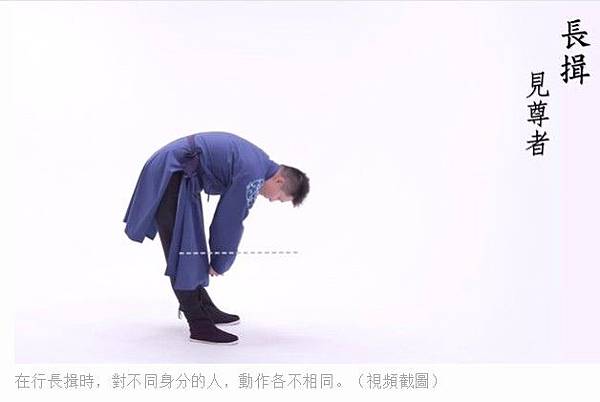 在行長揖時,對不同身分的人,動作各不相同。(視頻截圖)