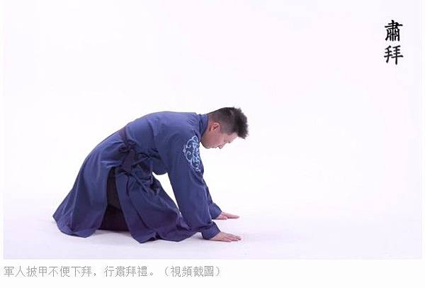 除了婦女外,軍人披甲不方便下拜也是以肅拜禮——也就是手拜到地上、頭不下地,或者抱拳禮做替代的。