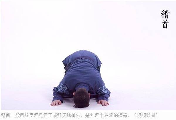 稽首一般用於臣拜見君王或拜天地神佛,是九拜中最重的禮節。(視頻截圖)