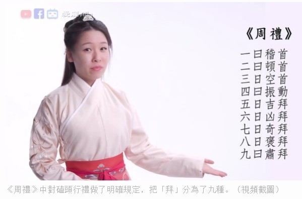 《周禮》中對磕頭行禮做了明確規定,把「拜」分為了九種。(視頻截圖)