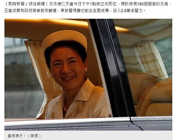 〔即時新聞/綜合報導〕日本德仁天皇今日下午1點將正式即位,預計將有180個國家的元首、王室成員和政府高官前來觀禮,東京警視廳也對此全面戒備,投入2.6萬名警力。