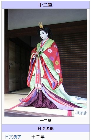 十二單的名稱首見於《源平盛衰記》。一般由5~12件衣服組合而成。按照不同季節,穿著人的身份和場合,十二單衣的顔色和花紋有特定的複雜搭配。(十二單不是指有十二件,而是說很多層,非常豪華,豪華到極點的意思)