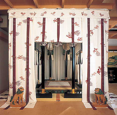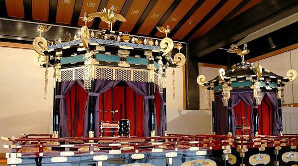 「高御座」是配合1915年嘉仁(大正)天皇即位時製作,高度約6.5公尺、重量約8噸,在組合上完全不用任何釘子;「御帳台」比「高御座」略小,高度約5.5公尺。「高御座」與「御帳台」,在明仁(平成)天皇即位禮使用後,被送往京都御所內紫宸殿收藏,為了今日的即位禮,「高御座」與「御帳台」於2018年在京都被分解後送抵東京皇居內,由專家於今年9月完成重新上漆與修復。