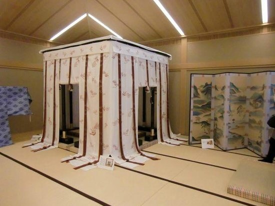 中間站立者是今天的模特兒↓,她扮演貴族。跪在她面前的是「前衣紋者」,後面的是「後衣紋者」。工作中二人不能交談,全憑日常的訓練及默契。