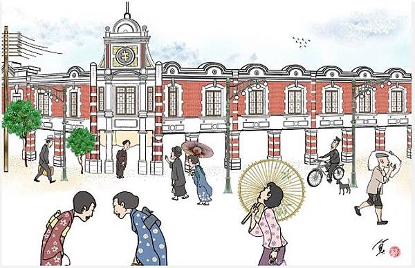 義重町要從現在的義二路和信二路口的「岸田吳服店」(約信二路290-1號)開始說起。這棟街屋聳立在時光隧道的入口,原是一座二層樓維多利式紅磚白飾帶建築(如我所畫的圖),高聳的山牆,中間有鑲有片假名「キ」,應是取キシダ(岸田)的首字為記,兩旁有圓拱窗,其上有拱心石,留有亭仔腳令行人便利通行。由於位置顯著,建築搶眼,乃成為義重町的地標。屋主是廣島縣賀茂郡西志和村人的岸田多一郎,他在1897年(明治30年)渡海來台,從基隆上岸後就在「吳服太物商」辛勤打拚,學習做生意。
