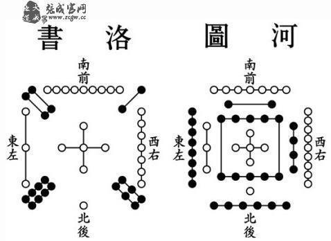 相傳大禹治水之時,理龜載文於背而出洛水,得而因之成“九疇”,謂之“書”,古稱為“洛書”。然而,後來見到的洛書,沒有文字,也只有用黑白環點示數的圖(有稱為“洛圖”)。該圖有言曰:戴九履一,左三右七,二四為肩,六八為足,五環居中。 後來,周文王據河圖和洛書而演八卦,奠定了中國易學文化的基礎。
