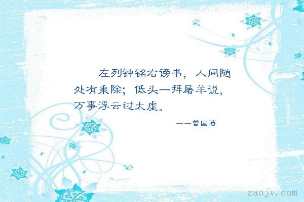 他用這首詩告訴曾國荃:「左列鍾銘右謗書」。功名成就後,儘管左面掛滿了朝廷的褒獎,但不要忘記在主子右邊還放著毀謗、詆罵我們的信件。一定要記住功高震主的教訓,不必因此自滿自傲。對誹謗之言也不必懼怕,沒有什麼了不起。「人間隨處有乘除」。榮辱、禍福、進退、得失,都沒有定數,不會永久不變,不必想不開。「低頭一拜屠羊說」。只要能像屠羊說那樣對待名利得失,功成名退,就能自保無慮。「萬事浮雲過太虛」。一旦進入如此境界,就能超凡脫俗,遠離塵世,什麼榮譽、誹謗,都不過是天上的一片浮雲,一會就要被風吹散的,留下的依然是白雲藍天。正於曾國藩自己所說:官兒盡大有何榮?字數太多看不清。減去幾行重刻過,留教他日寫銘旌。