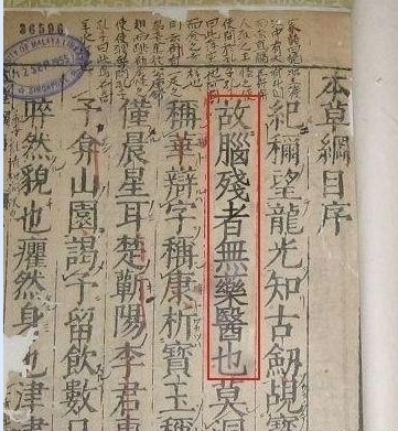 李時珍的本草綱目裡真有'故腦殘者無藥醫也'這句話嗎?假新聞--原句如下: “紀稱望龍光,知古劍;覘寶氣,辨明珠。故萍實商羊非天明莫洞。厥後博物稱華,辨字稱康,析寶玉稱倚頓,亦僅僅晨星耳。”