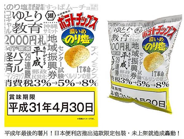 這款充滿紀念價值的薯片,在包裝上可是相當用心,印上了滿滿平成年間發生的大事詞彙,除此之外,最特別的是它的賞味期限到 4 月 30 日,正好是平成年的最一天,正面包裝下方印有大大的「賞味期限:平成 31 年 4 月 30 日」,另外在口味上的選擇也別具心裁,選用「濃厚」海苔鹽味,來讚譽平成年代的豐收,此售價為 165 日圓(約台幣46元),讓大眾以最輕鬆日常的方式向即將走入歷史的平成年代道別,謝謝你平成年。