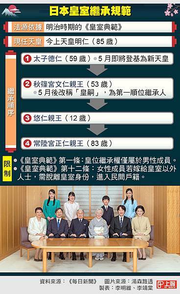 目前日本皇位繼承人選共有4名,第一順位是5月即將登基的皇太子德仁,依序順位則是秋篠宮文仁親王(Prince Akishino)、悠仁親王和常陸宮正仁親王(Prince Hitachi Masahito)。