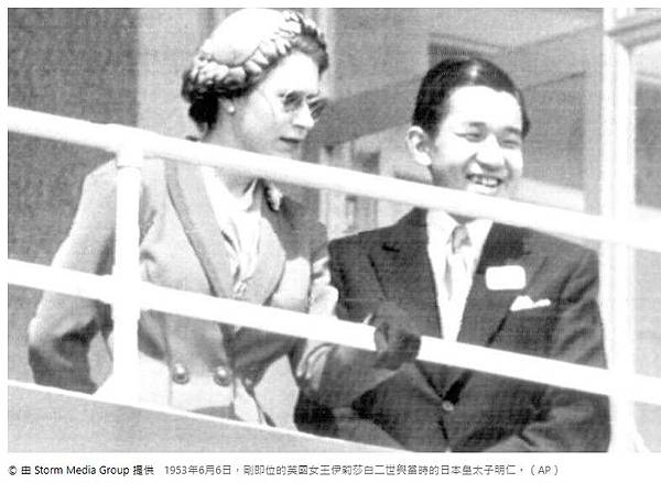 © 由 Storm Media Group 提供 1953年6月6日,剛即位的英國女王伊莉莎白二世與當時的日本皇太子明仁。(AP)
