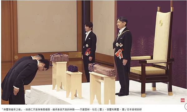 〔即時新聞/綜合報導〕日本明仁天皇退位,德仁天皇今(1日)上午10時30分許(台灣時間9時30分),在天皇皇居松之間宮殿舉行即位的劍璽繼承儀式,象徵性地接受國璽、玉璽和三神器之中的天叢雲劍、八尺瓊勾玉,目前已完成即位儀式,令和時代正式來臨。
