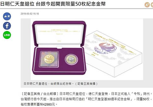 限量50套 台銀開賣明仁天皇紀念幣 售價4萬2980元 http://bit.ly/2WkJPPT