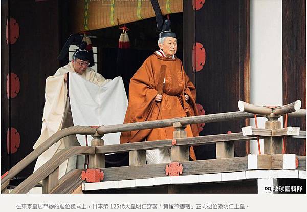 日皇明仁將在4月30日退位,平成年號走入歷史。3月12日明仁天皇穿上沿用中國唐法所製作的朝服「黃櫨染御袍」,前往皇居「宮中三殿」中的「賢所」,朗讀「御告文」,向皇室列祖報告退位日期,正式啟動天皇的退位儀式。