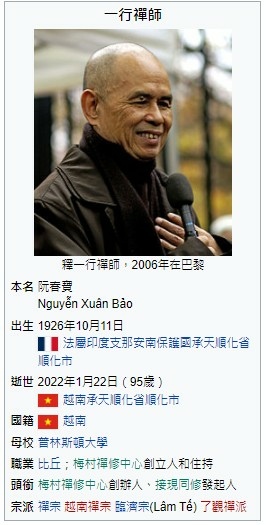 釋一行:現代著名的越南籍佛教禪宗僧侶、作家、詩人、學者暨和平主義者,現居南法多爾多涅省的「梅村」。 釋一行 - 維基百科,自由的百科全書