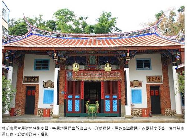 林氏家廟堂屋建築特別高聳,每間均開門由簷廊出入,形勢壯闊,屋身高聳壯闊,燕尾弧度優美,為竹縣宗祠佳作。記者郭政芬/攝影