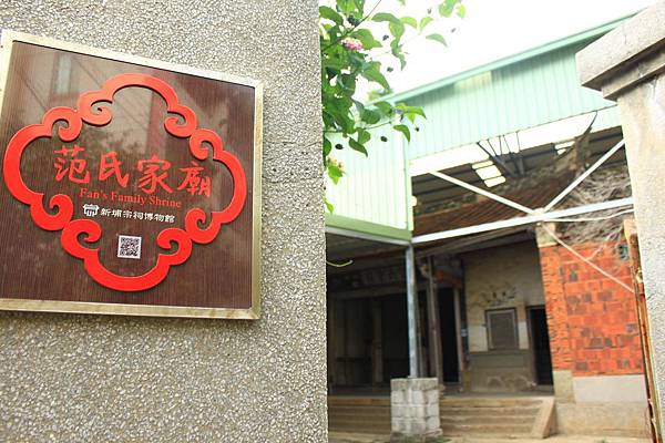 范氏家廟為新埔最早建立的祠堂,正整修中,建築體顯得高聳莊嚴。大門採三關六扇門作法,上方懸掛「范氏家廟」匾額一方,以彰顯本家廟身份。