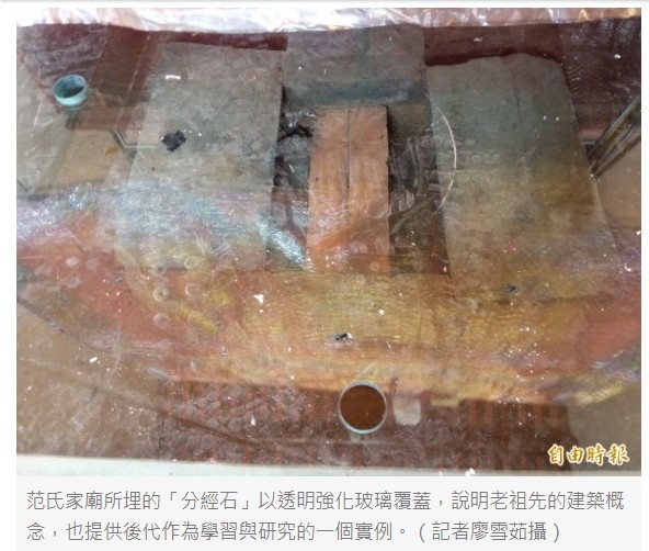 更值得一提的,是在本次整修的地坪整理過程中,挖出過去施作建築很重要的經緯及風水指標「分經石」,分經石一般是過去起造重要建築時,為了對準建築物的中心線,以確認建物方位,並符合地理風水,所埋下的磚石,據文史工作者的考證,底下甚至埋有起造人的相關資料,一般廟宇或是重要建築,會將「分經石」埋藏於地下,本次工程,發現老祖先的建築奧妙,經由范氏家族同意,決定將「分經石」覆蓋透明強化玻璃,除了說明老祖先的建築概念,也提供後代作為學習與研究的一個實例。