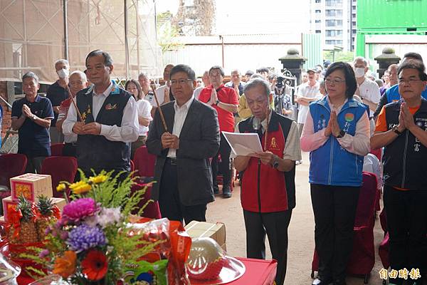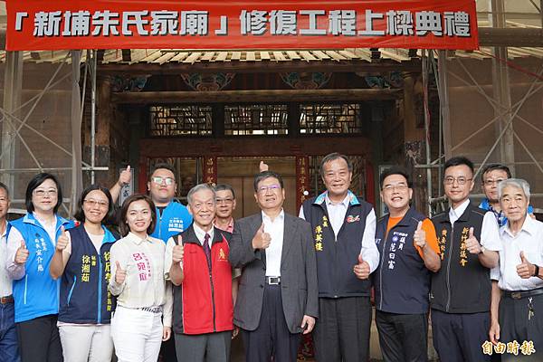 〔記者黃美珠/新竹報導〕新竹縣縣定古蹟新埔朱氏家廟修復工程今天上樑,縣長楊文科、朱氏家廟管理人朱建全、新埔鎮長陳英樓以及新埔議員、新埔各宗祠代表、朱氏家族代表成員等皆到場,祝賀家廟主體結構完成,其梁永保建築的穩固與堅實。