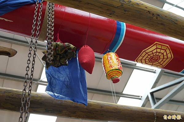 縣府文化局表示,新埔朱氏家廟的大梁上高掛著天燈、紅布、粳粽、以及青布等吉祥物,各自代表天、地、人、以及青龍,闡揚大梁肩負著承天、接地、天人合一、萬事和諧的重任。(記者黃美珠攝)