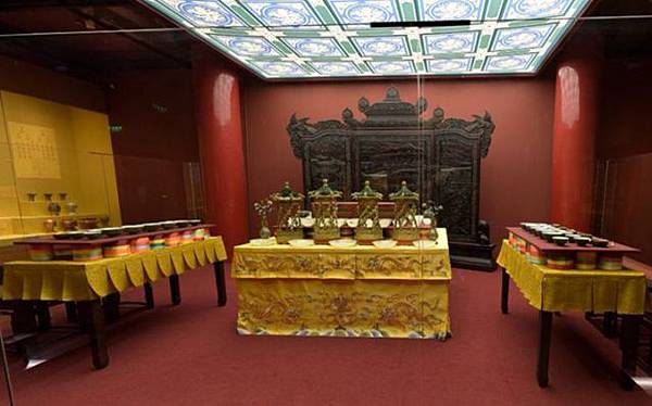 展廳內還復原了當年皇帝過年宗親宴的金龍大宴桌與宗親宴桌,餐盤擺放方式比照乾隆48年的膳檔記載,動用文物超過100件;雖然現場沒有真正食物,光看碗盤,果盒,筷子等餐具的精緻擺放方式,即可一窺皇室用餐的氣派。