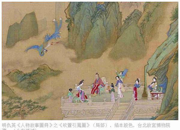 明仇英《人物故事圖冊》之《吹簫引鳳圖》(局部),絹本設色,台北故宮博物院藏。(公有領域)