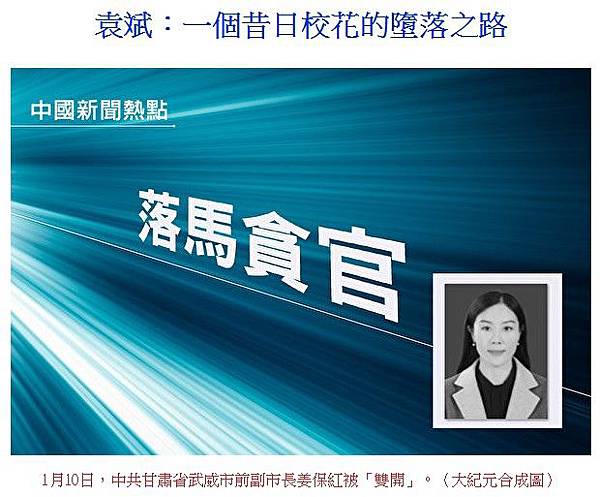 中國大陸的「反貪腐」行動,在各地掀起一波波浪潮。其中甘肅省武威市的前副市長姜保紅,過去就傳出她用「色誘」方式上位。日前現在官方也證實了這項消息,相關單位對她進行「雙開」,就是開除黨籍和開除公職。