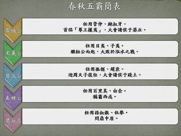 齊桓公、宋襄公、晉文公、秦穆公、楚莊王(可記為:齊宋晉秦楚)[2];