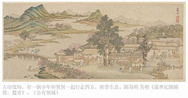 古印度時,有一個少年和舅舅一起行走四方,經營生意。圖為明 吳彬《歲華紀勝圖冊.蠶市》。(公有領域)