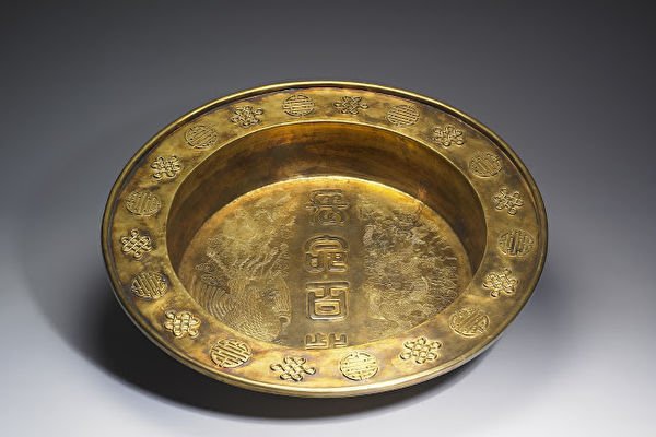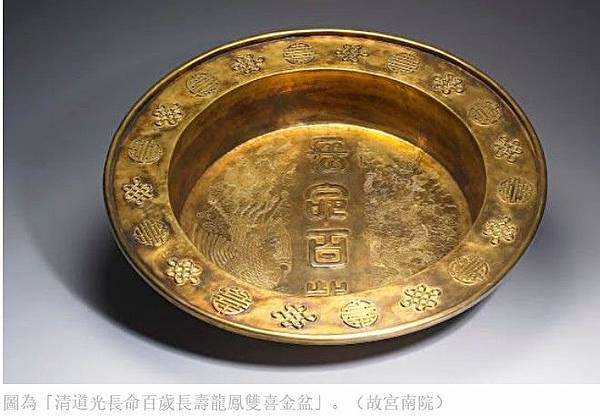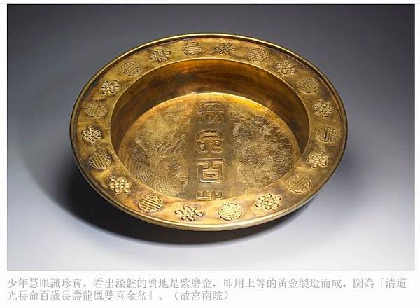 少年慧眼識珍寶,看出澡盤的質地是紫磨金,即用上等的黃金製造而成。圖為「清道光長命百歲長壽龍鳳雙喜金盆」。(故宮南院)