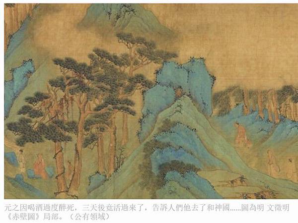 元之因喝酒過度醉死,三天後竟活過來了,告訴人們他去了和神國……圖為明 文徵明《赤壁圖》局部。(公有領域)