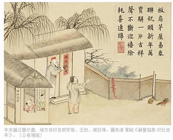 年末臘日慶冬盡,地方各村各家祭祖、五祀、謝百神。圖為清 黃鉞《龢豐協象‧村社迎年》。(公有領域)