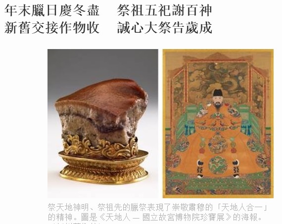 祭天地神明、祭祖先的臘祭表現了崇敬肅穆的「天地人合一」的精神。圖是《天地人 — 國立故宮博物院珍寶展》的海報。(新州藝術館)