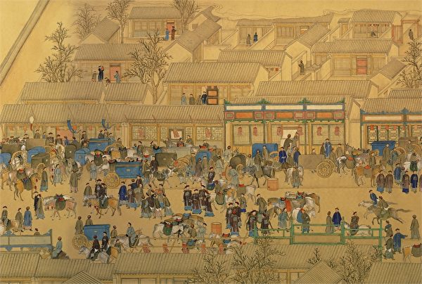 新年元旦文武官員進京朝賀,市井百姓也紛紛出門拜年、賀年、參廟、參神堂。圖為清 徐揚《日月合璧五星聯珠圖》局部,台北國立故宮博物院藏。(公有領域)