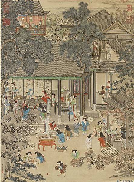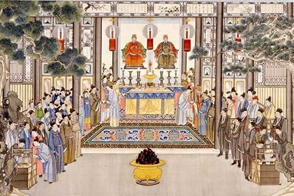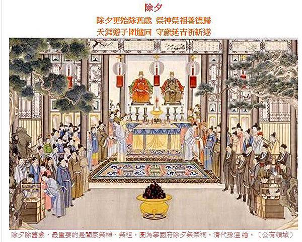 除夕除舊歲,最重要的是闔家祭神、祭祖。圖為寧國府除夕祭宗祠。清代孫溫 繪。(公有領域)