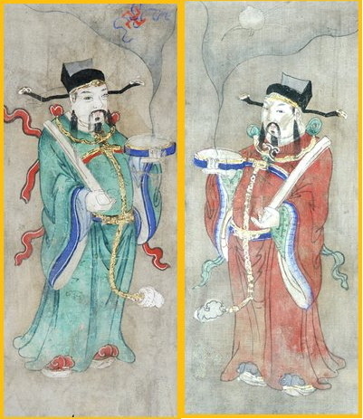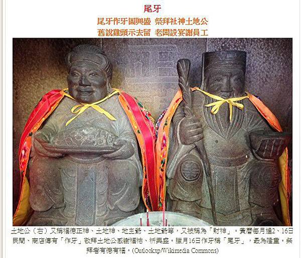 土地公(右)又稱福德正神、土地神、地主爺、土地爺等,又被稱為「財神」。黃曆每月逢2、16日民間、商店傳有「作牙」敬拜土地公感謝福祐、祈興盛。臘月16日作牙稱「尾牙」,最為隆重。祭拜者有德有福。