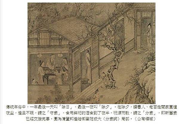 傳統年俗中,一年最後一天叫「除日」,最後一夜叫「除夕」。在除夕,讀書人、老百姓閤家圍爐夜坐,達旦不眠,謂之「守歲」,食用祭祀的酒食到了夜半,祝頌而散,謂之「分歲」,即新舊歲已經交接完畢。圖為清董邦達繪御筆范成大《分歲詞》局部。(公有領域)