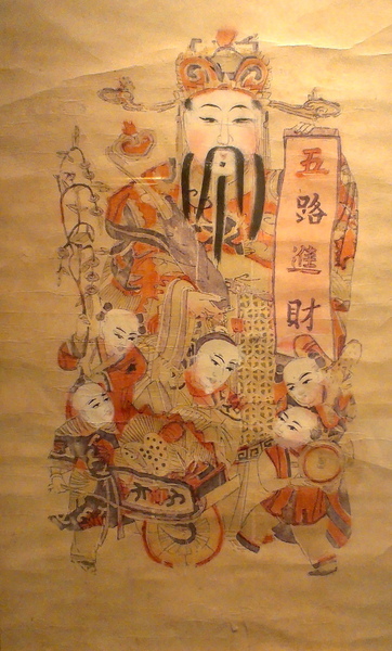 民間一般在大年初四祭拜「五路神明」和「財神」,大年初五開市。「五路進財」單幅裝飾畫,將祭拜「五路神明」和「財神」合一。圖中一位身穿文官禮服的財神,一手執「如意」,一手展「五路進財」卷軸。財神面前有一大型聚寶盆,盆的四周有五童子各執象徵財寶的事物,有搖錢樹、寶馬、元寶等。五童子象徵五路進財的財神,神態活潑可愛又喜氣,畫工精緻,色彩絢麗。(來源:國立歷史博物館、鍾元翻攝/大紀元)