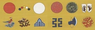 十二章紋/日月星山 龍華蟲宗彝 藻火粉米 黼黻/自右而左(第一列)日、月、星辰、山;(第二列)龍、華蟲、黼、黻;(第三列)宗彝、藻、火、粉米/「衣六章,畫日、月、星辰、山、龍、華蟲,裳六章,繡宗彝、藻、火、粉米、黼、黻」 @ 姜朝鳳宗族 :: 痞客邦 :: - https://goo.gl/UBGhQe