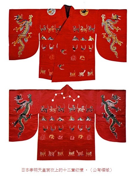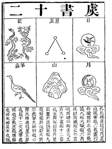 古代禮服(章服)繡有日月、星辰等圖案,每圖為一章,天子十二章,群臣按品級以九、七、五、三章遞降。圖為章服之圖。(公有領域)