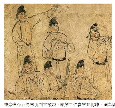 德宗皇帝召見宋沇到宣微院,讓樂工們奏樂給他聽。圖為唐代壁畫。(公有領域)