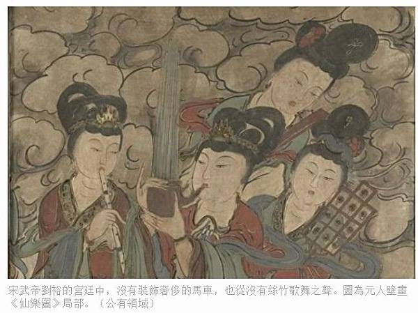 宋武帝劉裕的宮廷中,沒有裝飾奢侈的馬車,也從沒有絲竹歌舞之聲。圖為元人壁畫《仙樂圖》局部。(公有領域)