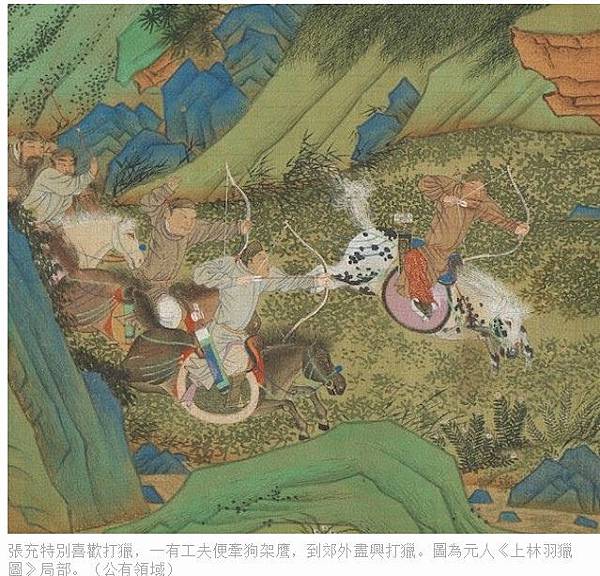 張充特別喜歡打獵,一有工夫便牽狗架鷹,到郊外盡興打獵。圖為元人《上林羽獵圖》局部。(公有領域)