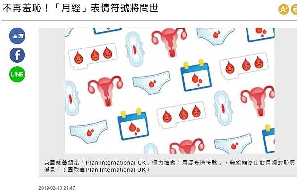 〔編譯陳正健/綜合報導〕女性月經在許多文化屬一大禁忌,但英國慈善組織「Plan International UK」近來極力推動「月經表情符號」,希望能終止對月經的恥辱偏見。
