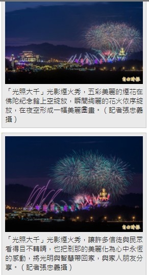 分享佛光山「光照大千」光影煙火秀 絢麗登場震撼人心到Facebook 分享佛光山「光照大千」光影煙火秀 絢麗登場震撼人心到Line