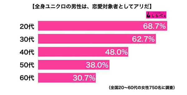 對此,日本媒體以「全身都穿 Uniqlo 的男生有可能成為戀愛對象嗎?」為題,對年齡20至60歲的女性進行問卷調查,發現全國年輕女性對於穿平價品牌的男生有6成的接受度,但隨著年齡增長,越成熟的女性越不能接受與全身都穿平價品牌的男生談戀愛。
